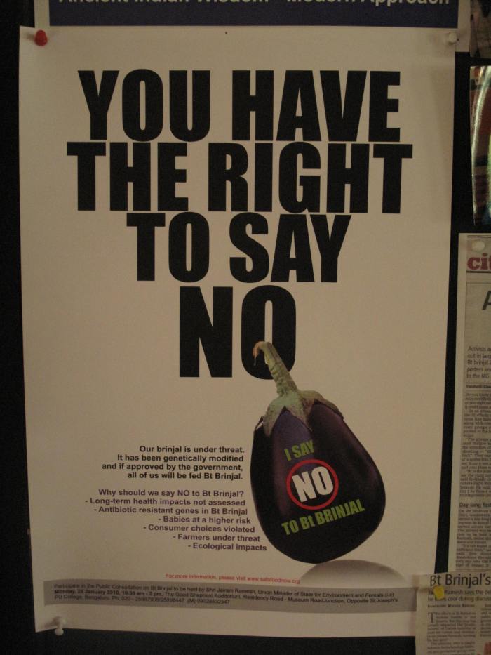 Jayaram and the staff at The Green Path spearheaded the protests against genetically modified eggplants being grown in India. The eggplants are engineered by Monsanto and are resistant to a herbicide that affects other plants, minimizing the need for weeding fields with human labor, but increasing monetary cost to farmers. In addition to the seed, the farmers also need to purchase the herbicide. This  increases the amount of chemicals being applied to the soil. The media coverage of the protests gave the staff at The Green Path a lot of exposure in the press. The protests proved successful. The government placed a moratorium on the growing of BT eggplant for commercial purposes in India.