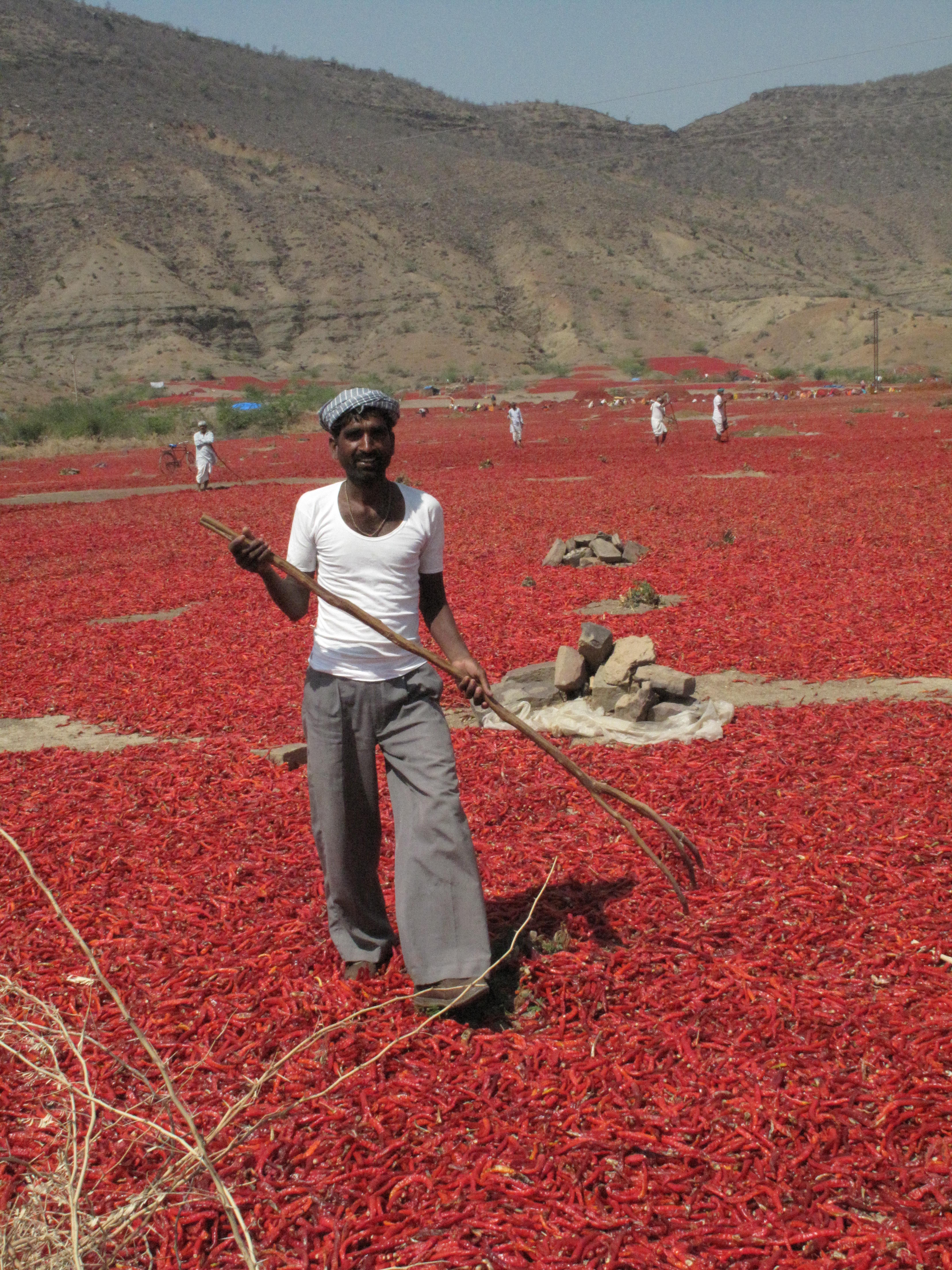 Through One Love Tours, Rachel and I were able to see some of the tourist attractions in remote areas of Rajasthan and Madhya Pradesh. Unlike the crush of traffic elsewhere in India, there were long stretches of open road between Ranthambore and Orccha. We drove through several types of farm land, including incredible fields full of drying chilies. Farmland then gave away to scrub land peppered with tiny villages. We passed many herds of native Indian cows being followed by one or two herders. Though many parts of India are becoming increasingly modern, this lonely stretch of highway felt timeless.