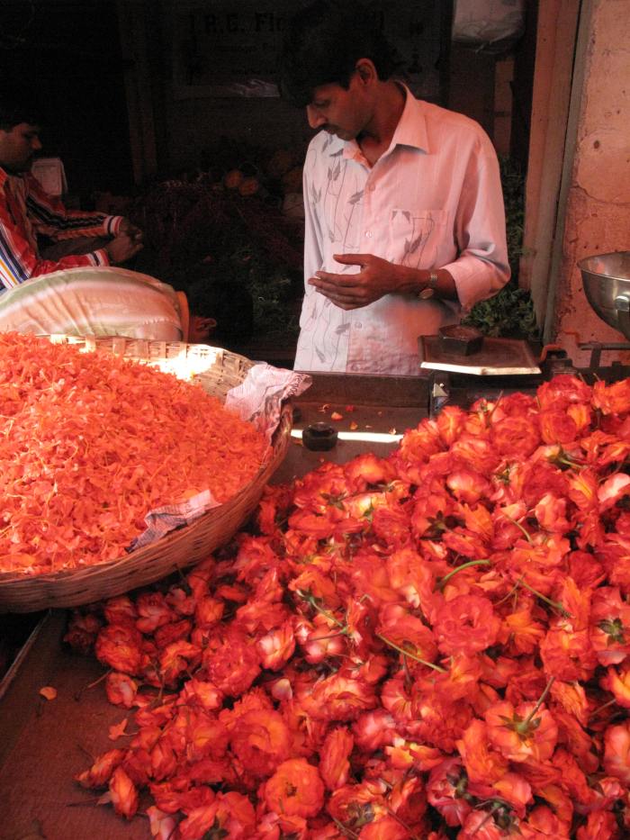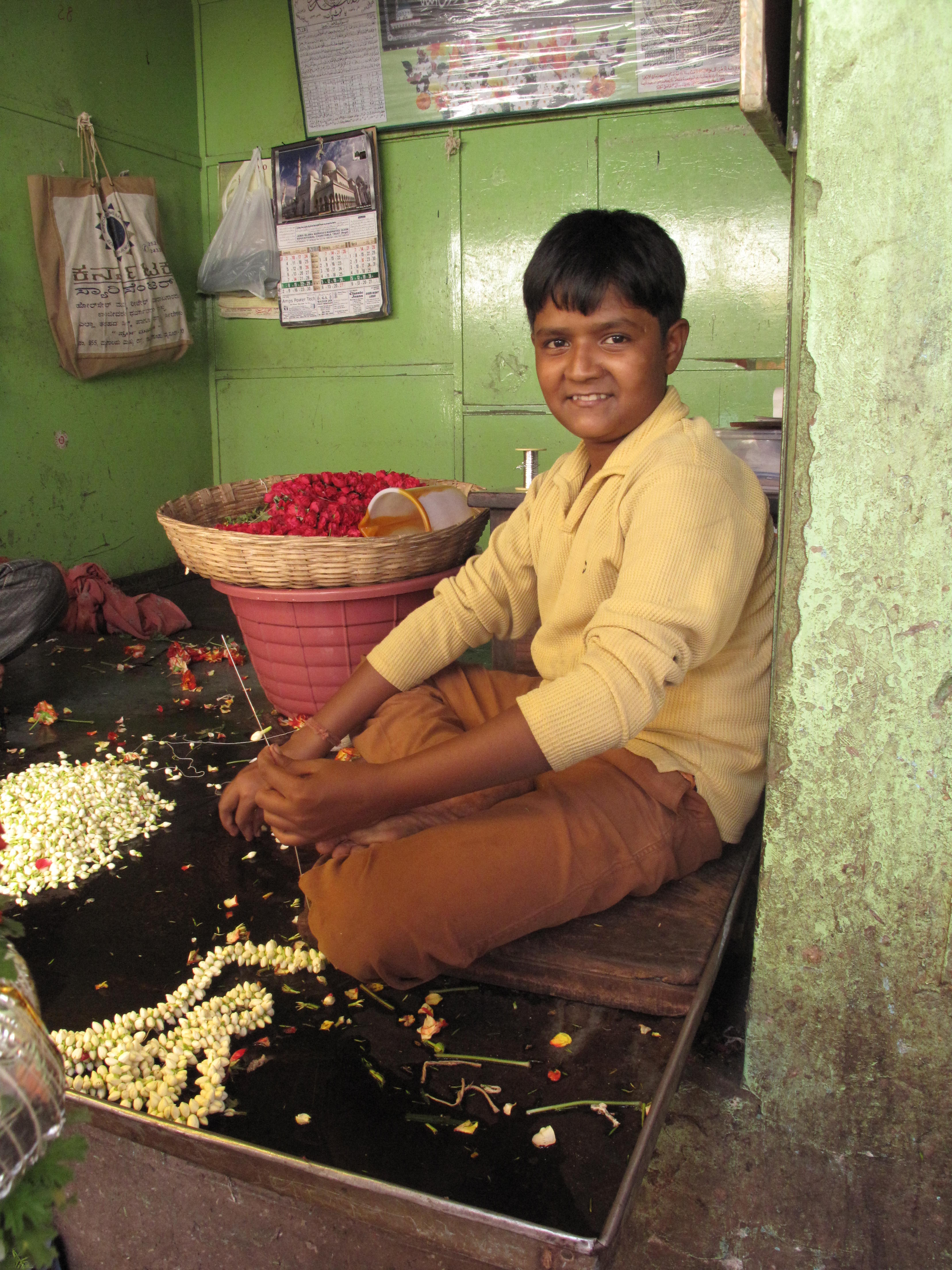 The next day I spent the afternoon at the Mysore City Market and fell in love with India again. This market is one of my favorite places in India because of the beautiful fruit and vegetable stalls, friendly vendors, and the air of vibrancy and decay that makes India feel both old and new all at once. I walked through the market’s busting flower isle where people strung flower heads together to sell for puja (worship). Like so many other things in India that I can’t comprehend, I found it unbelievable that so many flowers were strung together every single day and then sold bit by bit to adorn a statue of a god, a dead relative’s photo frame, or even a vehicle. The flower market was bustling and as loud as a crowded restaurant and bathed in a diffused light that gave everything a dream like quality that made me reach for my camera every time I visited the market.