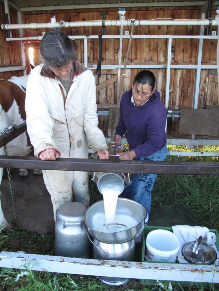 Ursula milks her herd of free-range dairy cows, once a day, in the mornings. Most of the milk production occurs in the spring. Without the aid of artificial insemination the majority of cows have most of their calves in the spring and milk production diminishes over the winter. A large portion of the  milk goes to raw-milk share members, who have bought shares in the herd so they can procure raw milk. In Colorado it is illegal to sell raw milk, but it is legal to drink it from a cow that you own. Every week the share members come to the farm to pick up their half-gallon mason jars full of raw milk in exchange for last weeks empty jars.