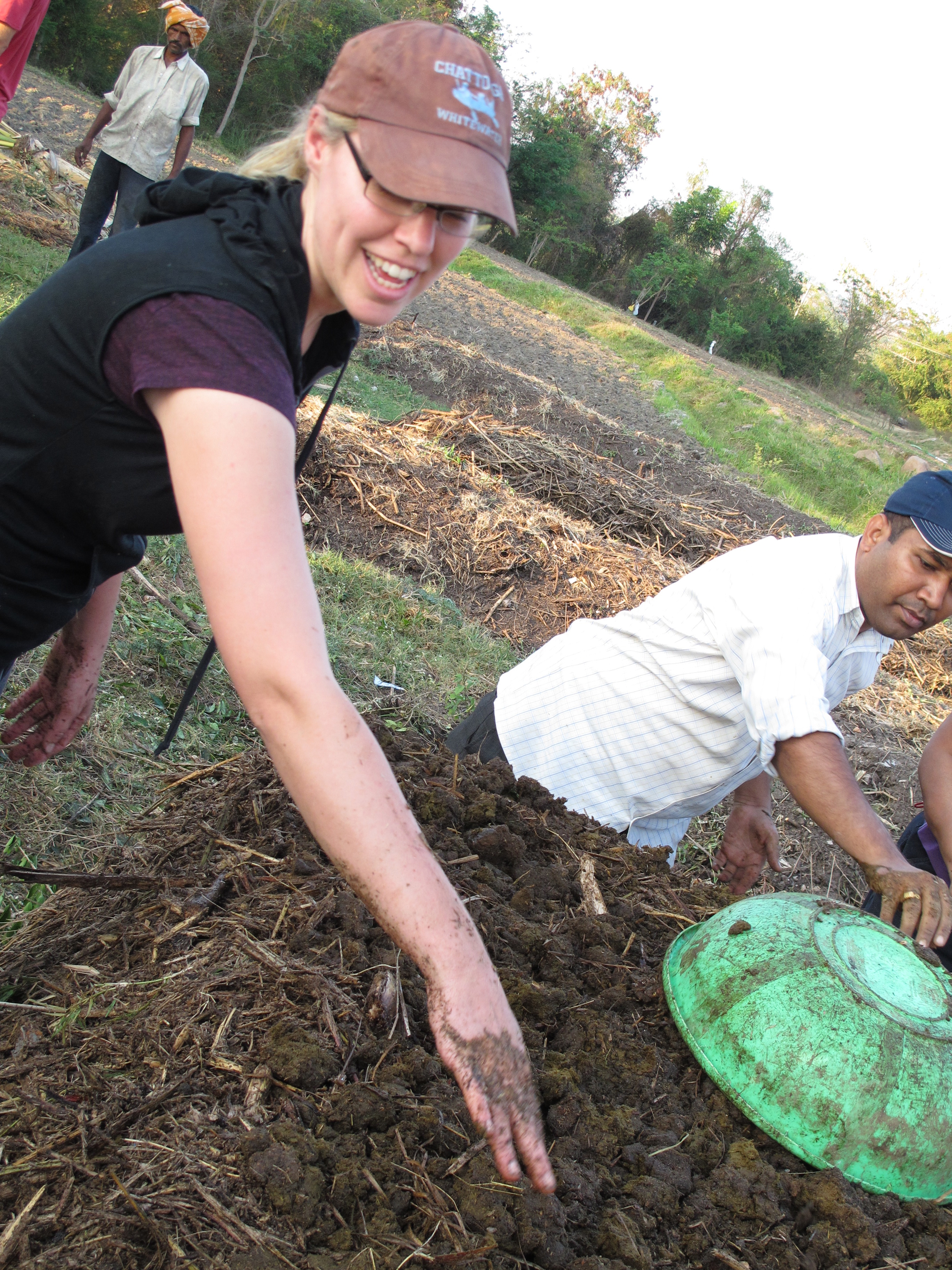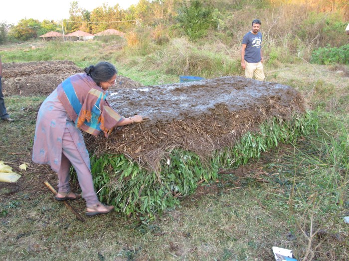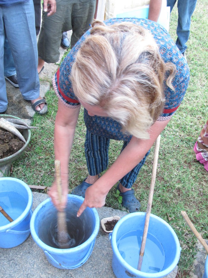 You may think that spending the afternoon spreading cow dung slurry along a pile of twigs is gross. Well, it wasn’t something I was overly excited about doing either, but to keep things in perspective I would far rather touch cow manure than put my hand in a bag of chemical fertilizer or run my fingers through a bucket of Round-up. I wasn’t worried about the risk of e-coli poisoning either, because the deadly strain of e-coli (e-coli 0.157:H7), is a result of the overuse of antibiotics in the conventional American farming system. Though e-coli exists in everyone’s intestines, the overuse of antibiotics created a super-bacteria that could withstand the presence of antibiotics. This rouge bacteria has created a serious public health problem in North America, but it wasn’t something I had to worry about at the BASIL institute, in Mysore, India. (That said, I did take a hot shower with special attention to a thorough hand washing.) Cow manure is not a taboo substance in India. It is still used today for everything from cooking fuel to floor cleaner, but it isn’t necessarily everyone’s job to handle it. That has historically been determined by a person’s caste. Now that the caste system is gradually eroding, those people who want to start biodynamic farming get familiar with manure in a hurry. Dr. Regina told me that when she first came to BASIL she wouldn’t go near manure, now she “dances in it.”