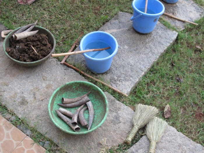 Raw materials needed to make preparation 500, cow horns, cow dung, buckets of waters and sticks to stir the preparation.