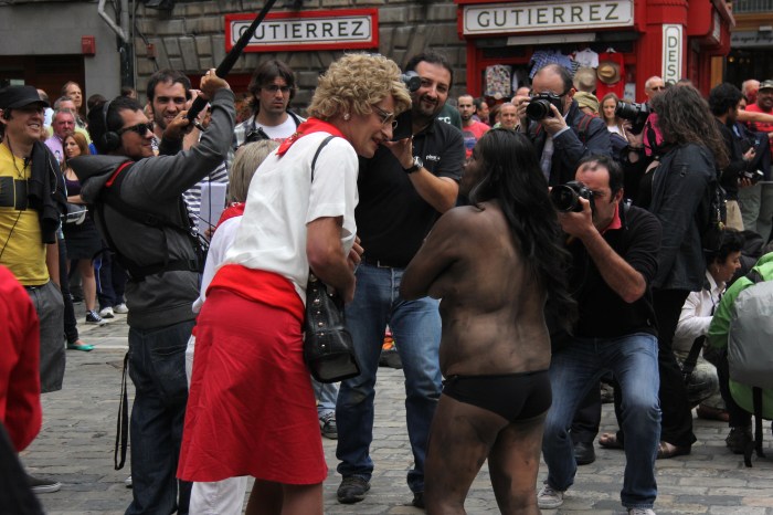 Last year the topless PETA protesters created an image of a bull with red blood pouring down its shoulders—as you would see in a bullfight. (You can see this image and others on PETA’s slightly out of date “Running of the Nudes” webpage.) This year they spelled out the slogan, “STOP FIGHTS.” The protest lasted an hour and was very peaceful. At the strike of noon the protesters began to form their installation, those painted red spelling out STOP and those painted black, spelling out FIGHTING. Once everyone was in place those with press passes filled the square. Film crews interviewed representatives from PETA as the still photographers stepped around the protesters taking photos. The most conspicuous interviewer was a 6’3’’ Spanish transvestite entertainer who asked one of the protesters why she had her arms crossed. She was asked in Spanish, “Are you cold?” The rest of us onlookers stood behind ropes that framed the protest.