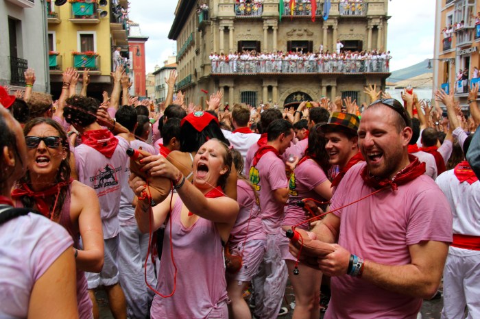 The txupinazo, a rocket fired at noon on July 6th, kicks off the festival and everyone dons their red bandanas, commemorating Saint Fermin, a Catholic martyr who was beheaded in France.