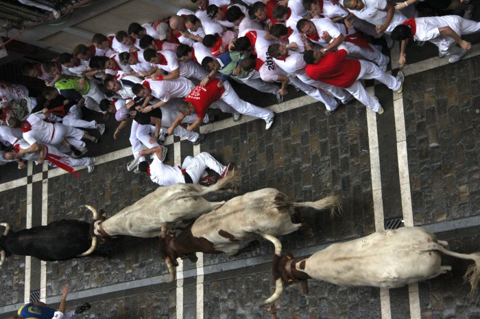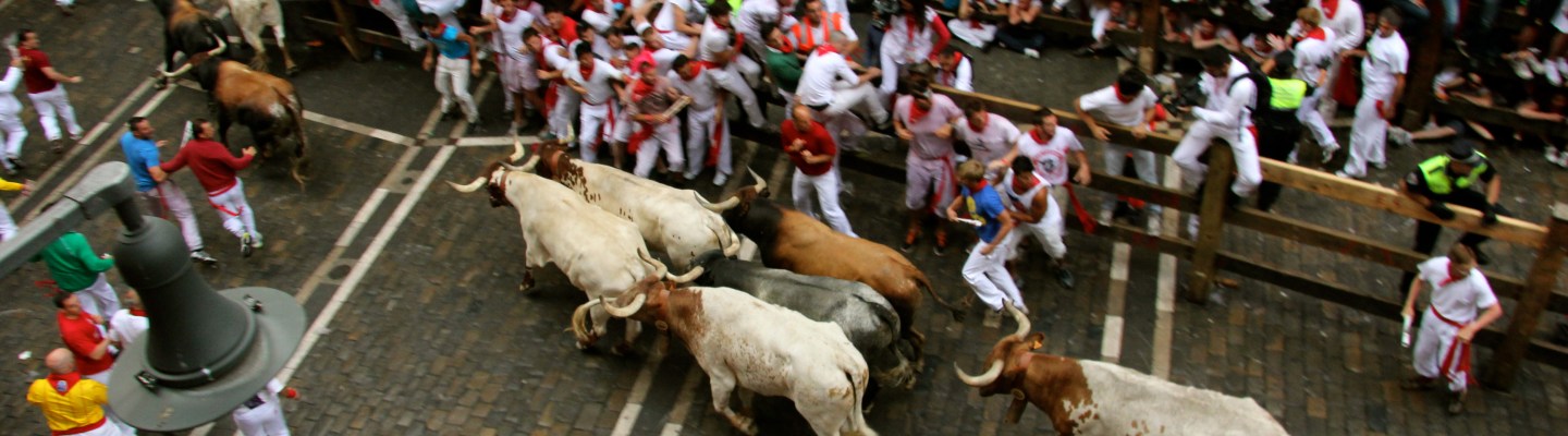 Because bulls can run up to 15 miles per hour (24 km/hour) and faster than humans, seasoned runners will plot out their course. To run in front of a bull’s horns for a brief burst of speed and then darts out without incident is considered an ideal run. For those that run along side the bulls, the rules state that it is off limits to touch the bulls but many runners put their hand on a bull if they are in close enough to do so. Seasoned runners hold a rolled up newspaper, which can be used to gauge distance or distract a bull’s attention, similar to a cape. There are six bulls and six oxen that run the course together. The oxen know the course and are there to give a sense of security for the bulls, which are less dangerous when running in a herd. Three more oxen are released two minutes after the run starts to pick up any bulls that might have fallen or gotten turned around on the course. The oxen are larger than the bulls and wear bells that hang from their necks. The sound of the bells and the clattering of hooves are part of the ominous ambience of the run. It happens that one or more bulls will outrun the oxen and surprise the runners who await the sound of bells to start sprinting. This is a dangerous situation. When a fighting bull is separated his instinct is to charge. Not all domesticated bulls will charge a person when isolated from the crowd, but fighting bulls are bred specifically to charge and are more nervous and more dangerous than many other breeds of cattle.