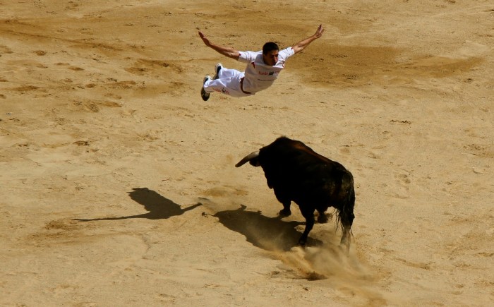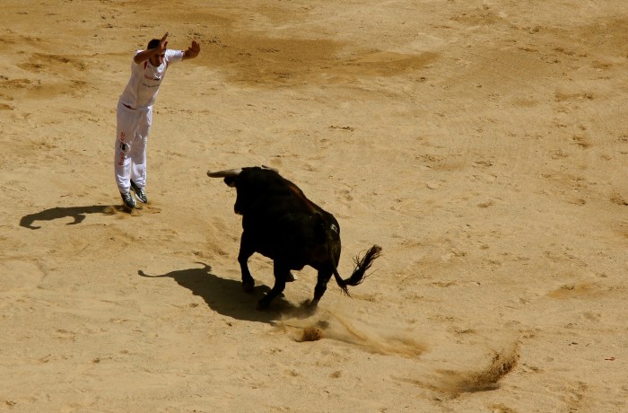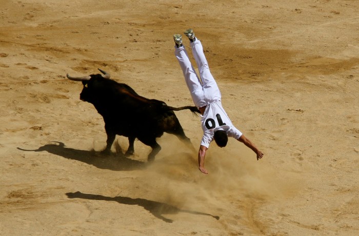 There are several Fiesta Taurina (games with bulls) events other than the Encierro (“Running of the Bulls”) at the week-long San Fermin Festival in Pamplona, Spain. In addition to the bull run and bull fights each day, there is a Novillero Corrida (novice bullfight), a Corrida de Rejones (bullfight on horseback), the Vaquilla (games with heifers) and Concurso de Recortes (bull-leaping acrobatics). Bull leaping acrobatics is a non-violent form of games with bulls in which a team of four compete against each other. The unarmed competitors confront bulls At face to face in the ring and only through immaculate agility and timing do they avoid being pummeled by bulls. Each individual is scored individually, but their success depends on their team mates to encourage the bulls to charge in straight line and distract the bull if the leaper gets into a dangerous situation. In my opinion the bull leapers have more courage than matadors as the the bulls they encounter in the ring are at the height of their power—unlike fighting bulls that are wounded and loosing blood throughout the fight—and come within inches of the 1,500 pound animals.